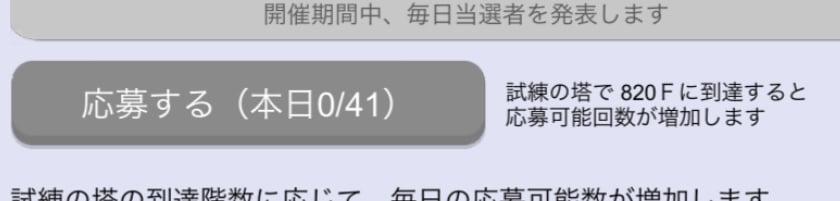 試練の塔は800階までと5chに書いてありました。 懸賞応募の上限は40回ですか? ご存知の方、教えてください。