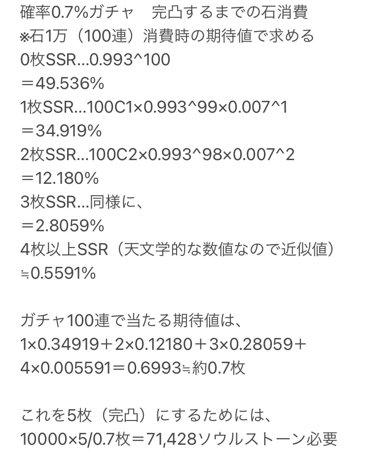 >>652 そのサイトクソサイトやな。確率0.7%ガチャだから100連した時の期待値が0.7枚なのは当たり前。なんでもそんなに長々と面倒い計算してるんだ?0.7/100×100連=0.7で終わりだろ。賢いですよアピールが甚だしい。(>>652に文句言ってるわけではないです。)