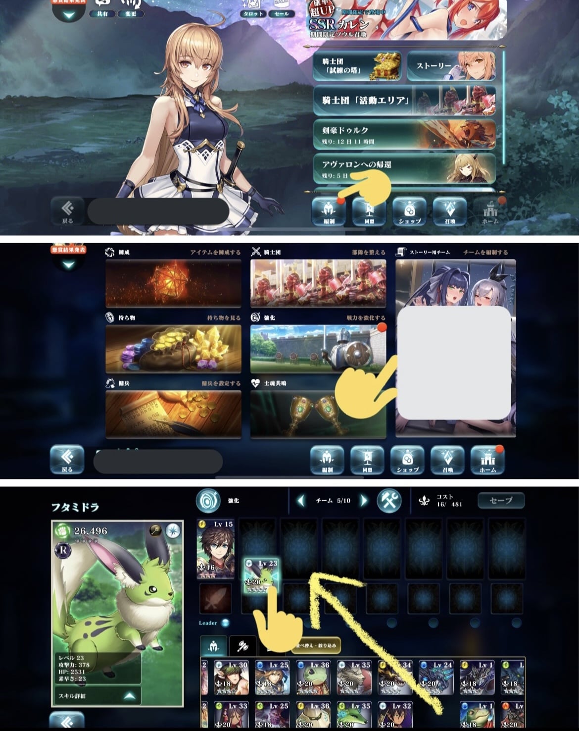 ホーム画面→「編制」→「ストーリー用チーム」で、メインストーリーやイベントクエスト用の8人チームを変更できます 下にいる控えメンバーをスライドさせて上の枠に移動させます ※画像参照 「編制」→「騎士団」では、王都争奪戦や闘技場、試練の塔などの5人チームを変更できます