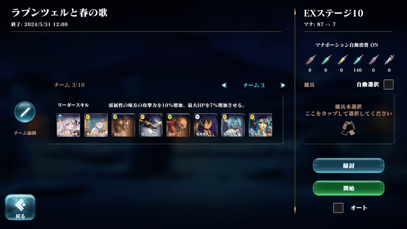 ラプとタワーが嫁アーニャ→水いばらの暁光からのローズラッシュで嫁リュド落ちて傭兵召喚→嫁アーニャがアイハで回復起床からのブラックアウト→あとはシンデレラのヒュプノスビート、いばらのドリーム〜、嫁アーニャのドリーム〜でラプンツェル攻撃、傭兵の仕事はクリアのみそれ以外はスキップ。アビスを装備してると丁度2体起きると嫁アーニャにターン回ってきてブラックアウト打てます。