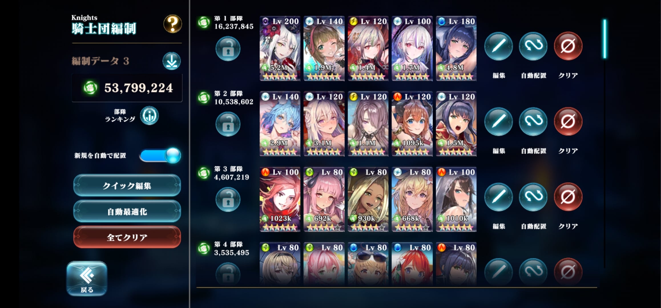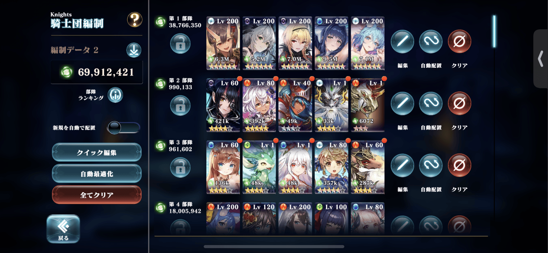 編成において、キャラ同士の相性も重要です。今の第1部隊はかなり育成が進んでいますが、ハロミラの燃焼を維持出来ていないのでは無いでしょうか?スタンやステルスは汎用的ですが、毒や燃焼は味方で足並みを揃えるべきです。各キャラのスキルをもう一度読んでみたり、試合のログを見てみると分かりやすいです。