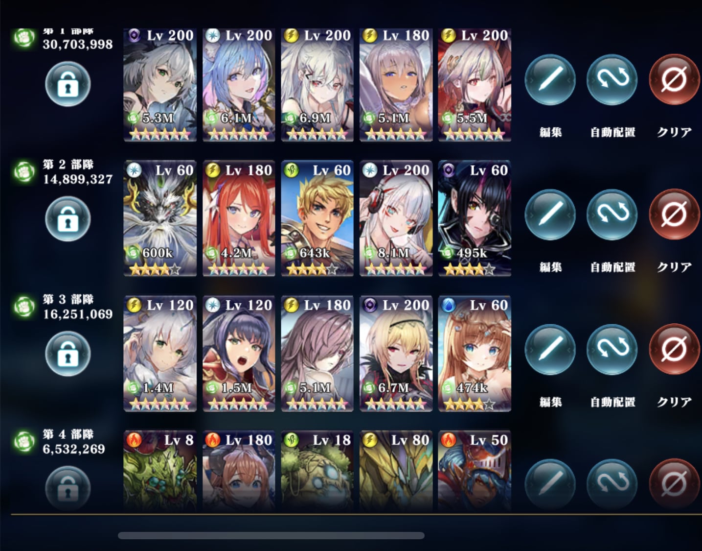 編成で悩んでおり、皆さんの力をお借りしたいです。 無凸Lv200光リュド、ハロミラ 完凸火ヒビキ、ガイア、ソウエン、アイドルミァシア、その他はそれなりです…3枚ほど連投しますので、1~4部隊になにを入れれば良いでしょうか?王都、争奪戦で活躍したいです(´;ω;`)