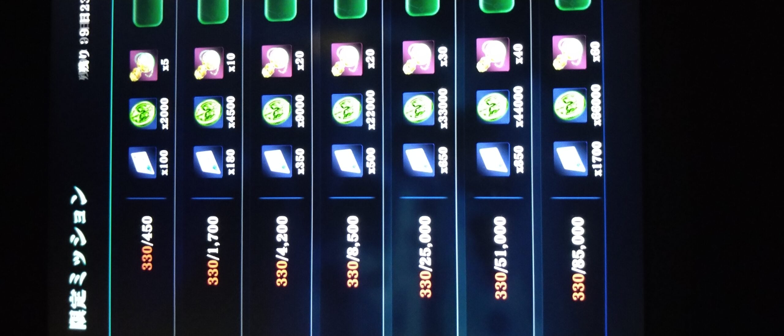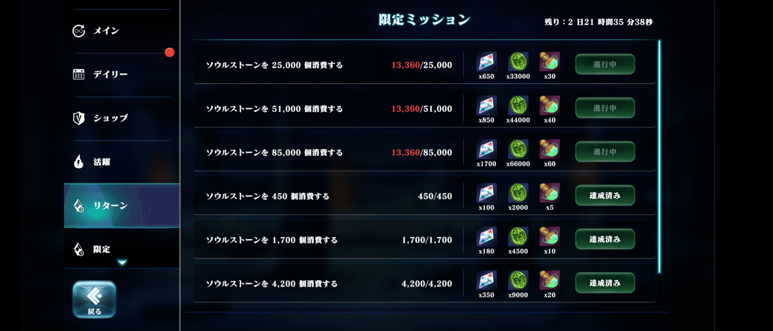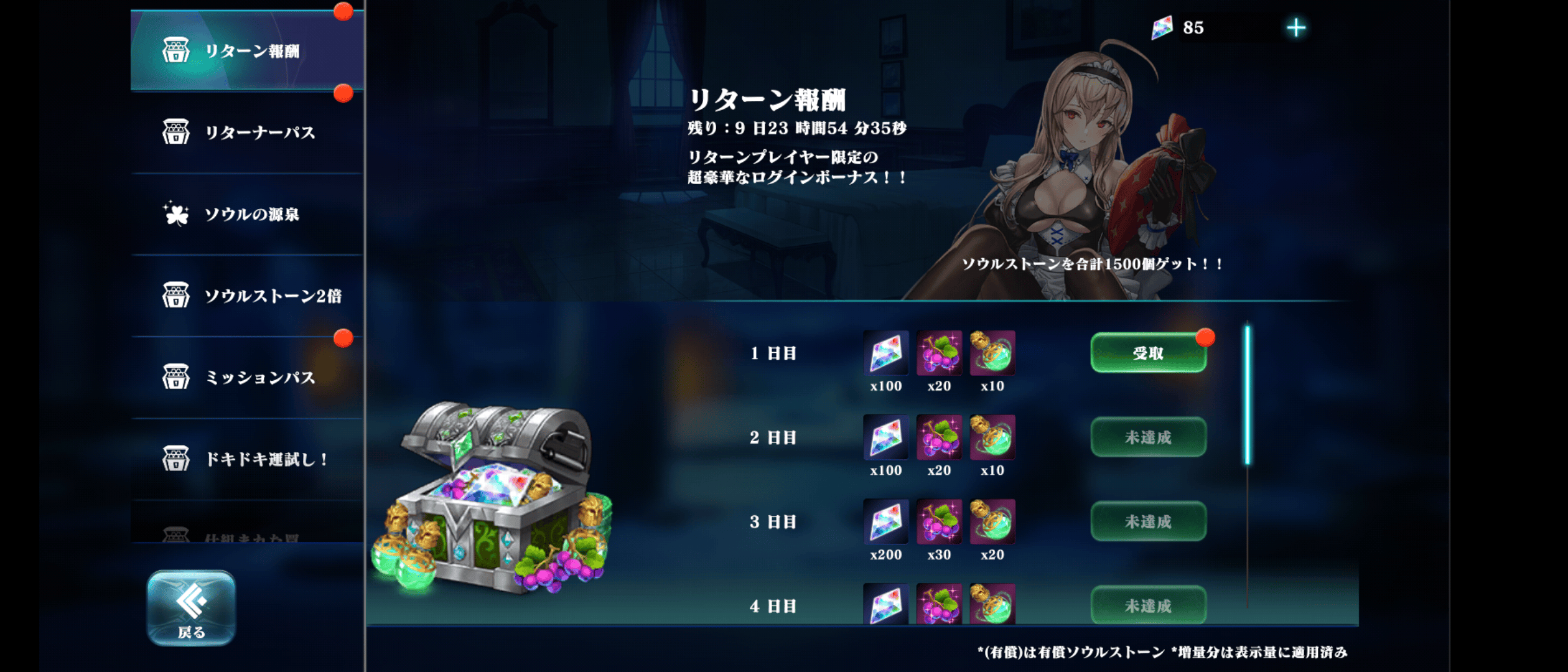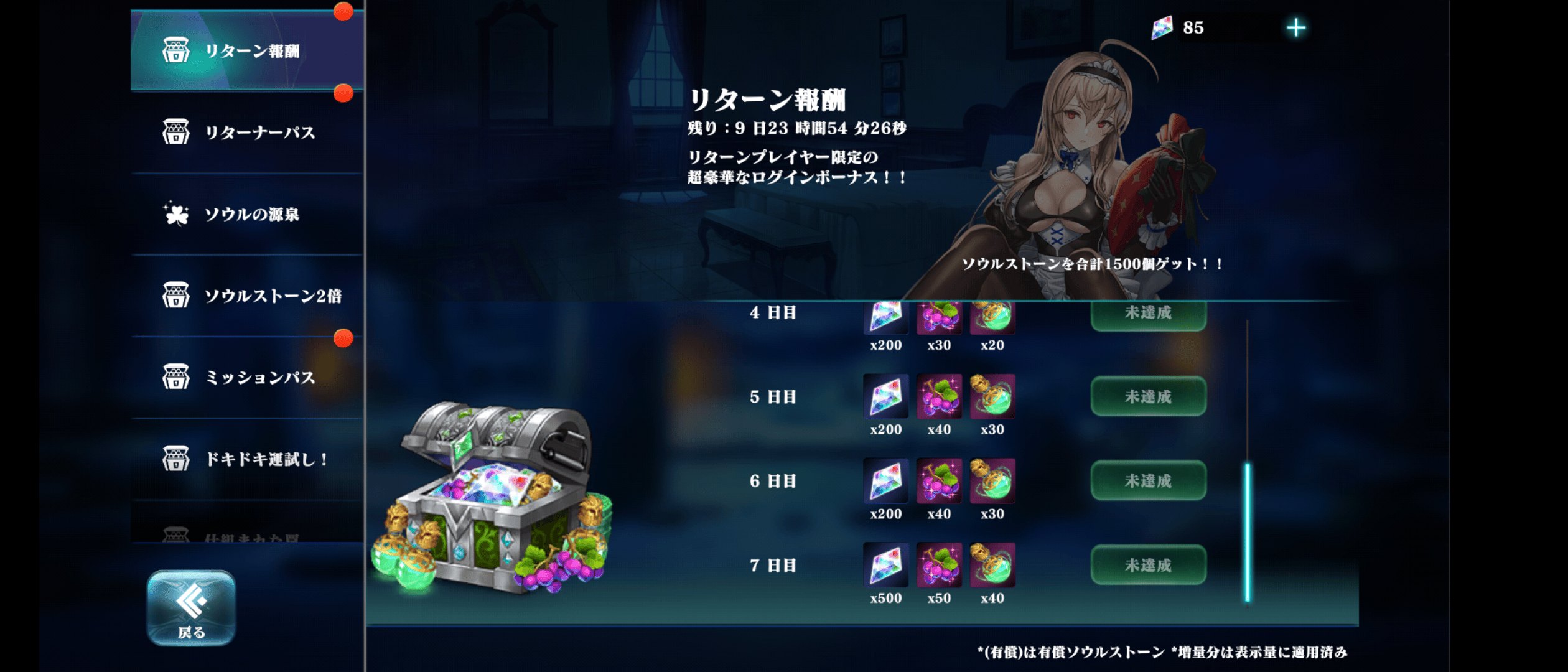 >>325 自己レスです。 ・復帰ボーナス:SSx1000 ・リターン報酬(合計:SSx1500、ぶどうx230、キャラ秘薬x160) ・1日目:SSx100,ぶどうx20、キャラ秘薬x10 ・2日目:SSx100,ぶどうx20、キャラ秘薬x10 ・3日目:SSx200,ぶどうx30、キャラ秘薬x20 ・4日目:SSx200,ぶどうx30、キャラ秘薬x20 ・5日目:SSx200,ぶどうx40、キャラ秘薬x30 ・6日目:SSx200,ぶどうx40、キャラ秘薬x30 ・7日目:SSx500,ぶどうx50、キャラ秘薬x40 ・リターナーパス(累積ミッションポイント) ・無料分合計:SSx700 ・有償(1200円):SSx1700+有償200,キャラ秘薬x70,キャラ経験x90,000 ・ソウルストーン消費(合計:SSx4330、キャラ経験x180.5k、キャラ秘薬x185) ・450消費:SSx100、キャラ経験コインx2000、キャラ秘薬x5 ・1700消費:SSx180、キャラ経験コインx4500、キャラ秘薬x10 ・4200消費:SSx350、キャラ経験コインx9000、キャラ秘薬x20 ・8500消費:SSx500、キャラ経験コインx22000、キャラ秘薬x20 ・25000消費:SSx650、キャラ経験コインx33000、キャラ秘薬x30 ・51000消費:SSx850、キャラ経験コインx44000、キャラ秘薬x40 ・85000消費:SSx1700、キャラ経験コインx66000、キャラ秘薬x60 リターン報酬、リターナーパス、SS消費の期限は10日後の0時まで 休んでいた期間の闘技場報酬も入手可能