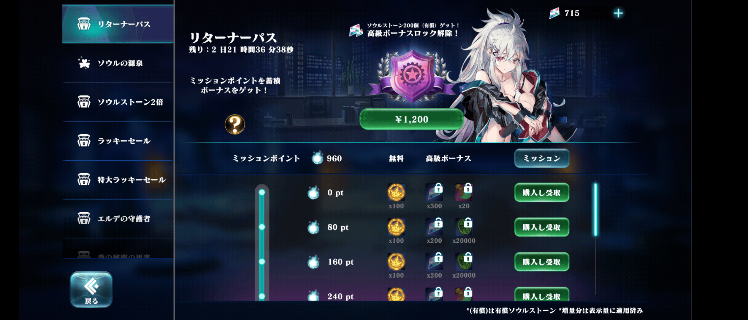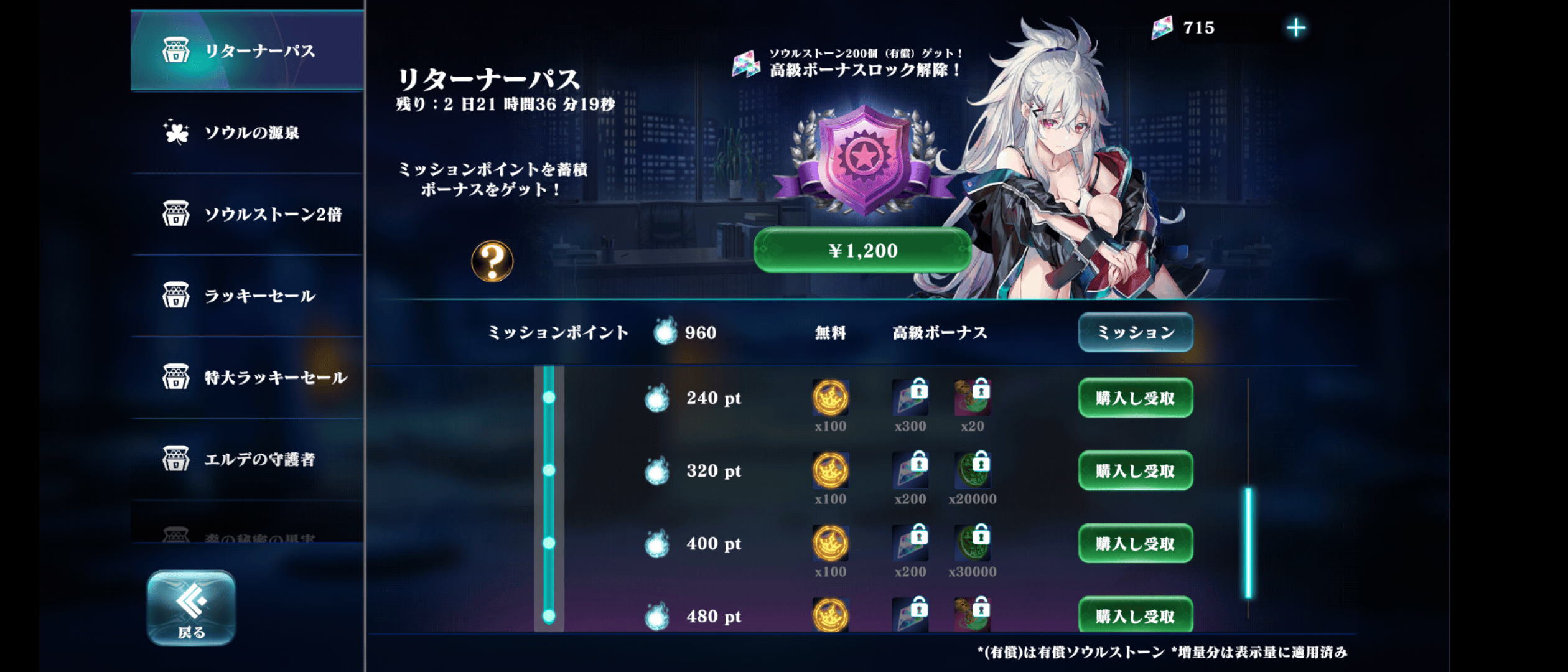 >>325 自己レスです。 ・復帰ボーナス:SSx1000 ・リターン報酬(合計:SSx1500、ぶどうx230、キャラ秘薬x160) ・1日目:SSx100,ぶどうx20、キャラ秘薬x10 ・2日目:SSx100,ぶどうx20、キャラ秘薬x10 ・3日目:SSx200,ぶどうx30、キャラ秘薬x20 ・4日目:SSx200,ぶどうx30、キャラ秘薬x20 ・5日目:SSx200,ぶどうx40、キャラ秘薬x30 ・6日目:SSx200,ぶどうx40、キャラ秘薬x30 ・7日目:SSx500,ぶどうx50、キャラ秘薬x40 ・リターナーパス(累積ミッションポイント) ・無料分合計:SSx700 ・有償(1200円):SSx1700+有償200,キャラ秘薬x70,キャラ経験x90,000 ・ソウルストーン消費(合計:SSx4330、キャラ経験x180.5k、キャラ秘薬x185) ・450消費:SSx100、キャラ経験コインx2000、キャラ秘薬x5 ・1700消費:SSx180、キャラ経験コインx4500、キャラ秘薬x10 ・4200消費:SSx350、キャラ経験コインx9000、キャラ秘薬x20 ・8500消費:SSx500、キャラ経験コインx22000、キャラ秘薬x20 ・25000消費:SSx650、キャラ経験コインx33000、キャラ秘薬x30 ・51000消費:SSx850、キャラ経験コインx44000、キャラ秘薬x40 ・85000消費:SSx1700、キャラ経験コインx66000、キャラ秘薬x60 リターン報酬、リターナーパス、SS消費の期限は10日後の0時まで 休んでいた期間の闘技場報酬も入手可能
