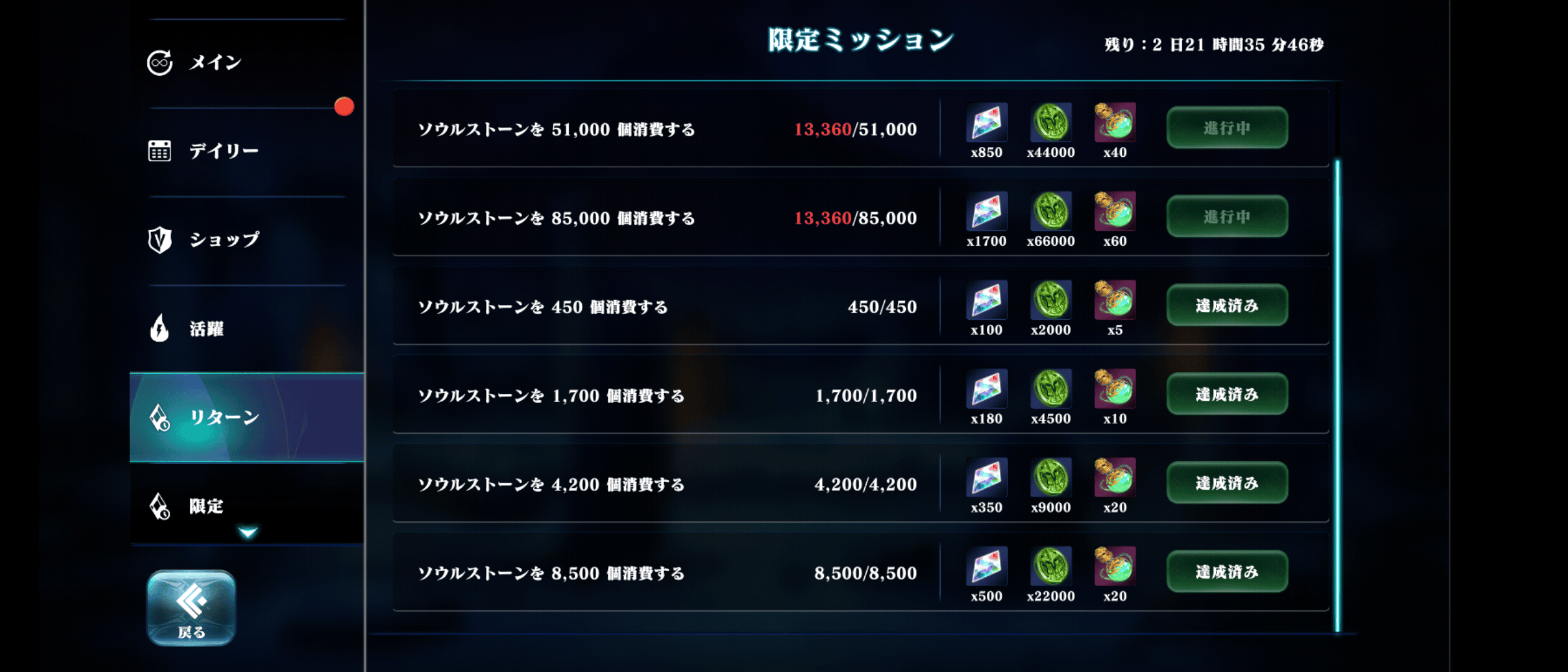 ・ソウルストーンを450,1700,4200,8500,25000,51000,85000個消費