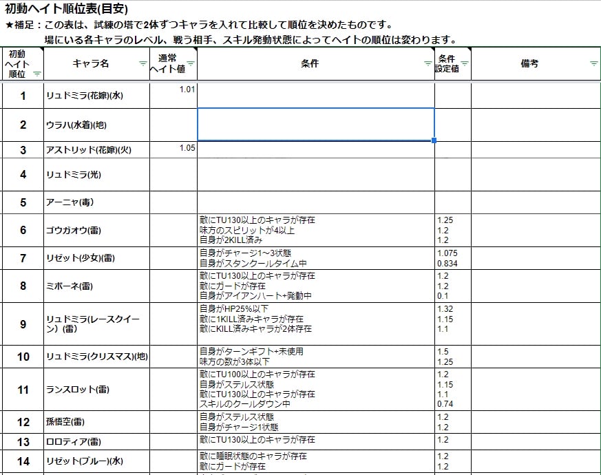 編集者様へご相談・お願いがあります。自分がプレイしているサーバーのメンバー向けのインスタに「初動ヘイト順位表」という一覧表を掲載しようと思っています。これはイベントバトルでキャラ2体のみを入れてどちらが先に攻撃されるかを比較して作ったデータです。AIは複雑なのであくまでも目安のデータです。ご相談ですが、このリストの中に編集者様が掲載されているAI解析ページのConditionとWeight情報を併記させていただけませんでしょうか?営利目的ではありません。ソースのURLと併せてクレジット表記はいたします。初動ヘイト順位と一緒にヘイトが上がる目安の条件が一目でわかるとメンバーが編成を組む時に非常にわかりやすいので、ご検討頂けると嬉しいです。(参考として画像も添付しました)メールアドレスがわからなかったので、場違いだったかもしれませんが、こちらに書かせて頂きました。