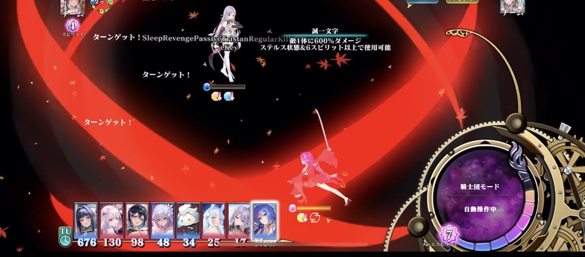 | 敵2体に攻撃。対象が眠り状態だと600%ダメージ。この攻撃は対象のダメージ減少効果を無視し、またこの攻撃のダメージでは対象の眠り状態は解除されない。この攻撃でダメージを与えた対象のいずれかが眠り状態だった場合、使用者のHPが全回復し、対象のどちらも眠り状態だった場合はさらに、使用者は自身のTUを0にして即座に次のターンを得る。自身のTUを0にする効果が発動した場合、このスキルはロックされ、このキャラが別のスキルで敵にダメージを与えるとロックは解除される。 | ||
