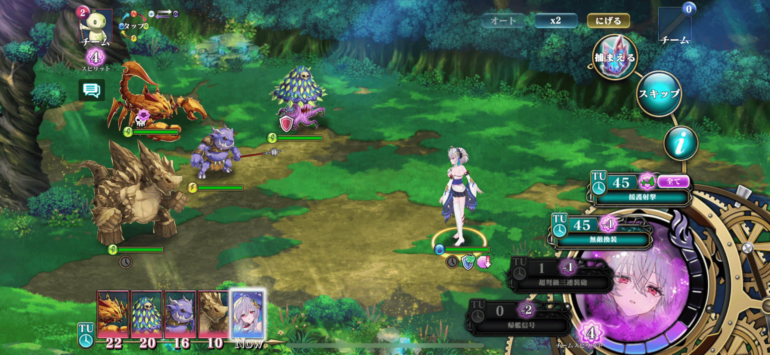 「無敵換装」は自身の全回復とクリアを行い、100TUの間は毒・燃焼・眠り・戦闘不能にならなくなるスキル。