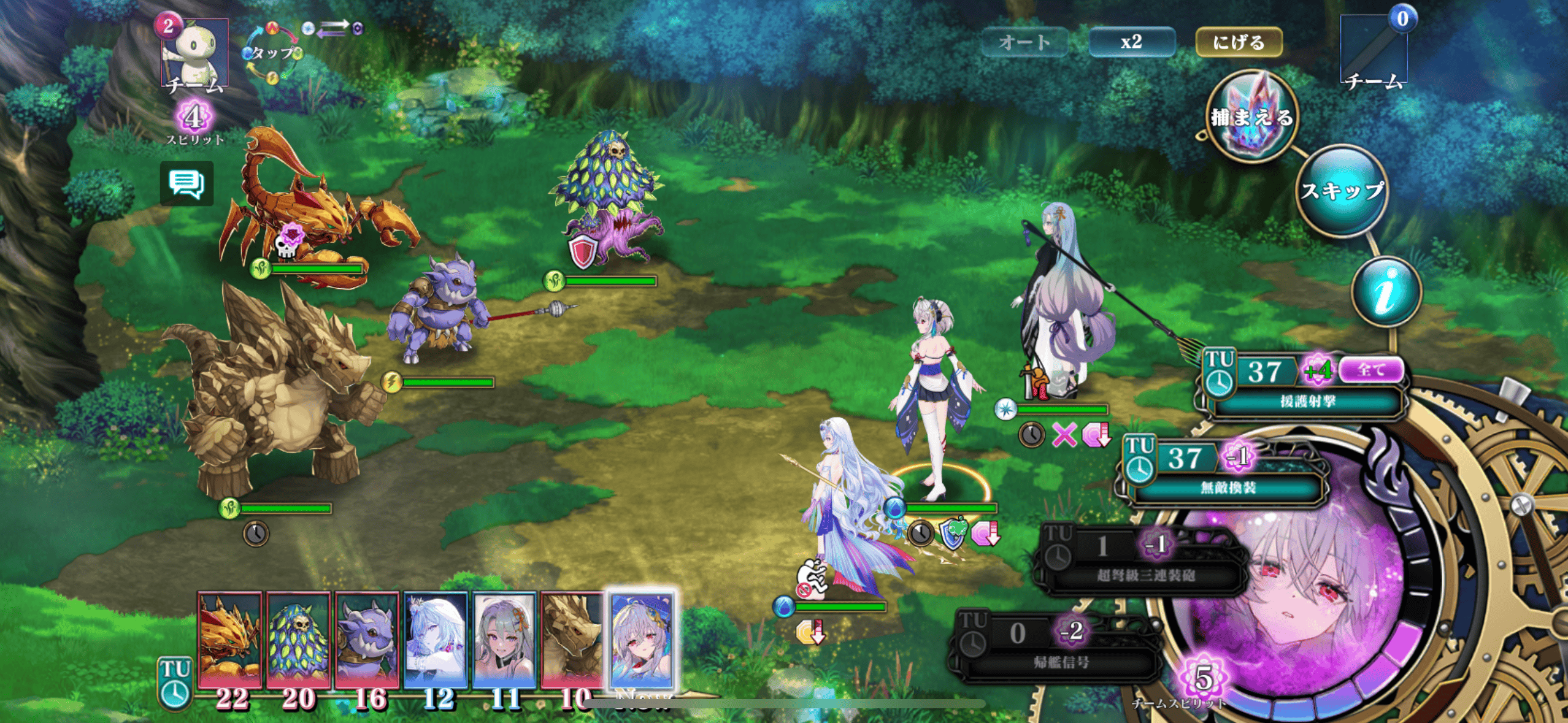 「大艦巨砲主義」のエンタースキルは、味方全体を回復させてアーマーを付与し、TUを50TU減少させる強力なもので、これによって控え運用も可能。