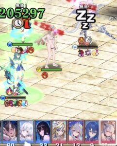 | 敵1体に300%ダメージ。この攻撃は、対象のダメージ減少効果を無視し、またアイアンハートなどHPが1を下回るダメージを耐えるパッシブスキル及びアクティブスキルの効果を無視する(ボスの持つスキルは除く)。 使用者が持つチャージ1個につき1体、攻撃対象を除くランダムな敵を対象に、状態変化「眠り」(100TU持続)を付与する。この眠り状態は対象が睡眠済みでも付与され、また対象の既存の状態変化は上書きされる。 |
