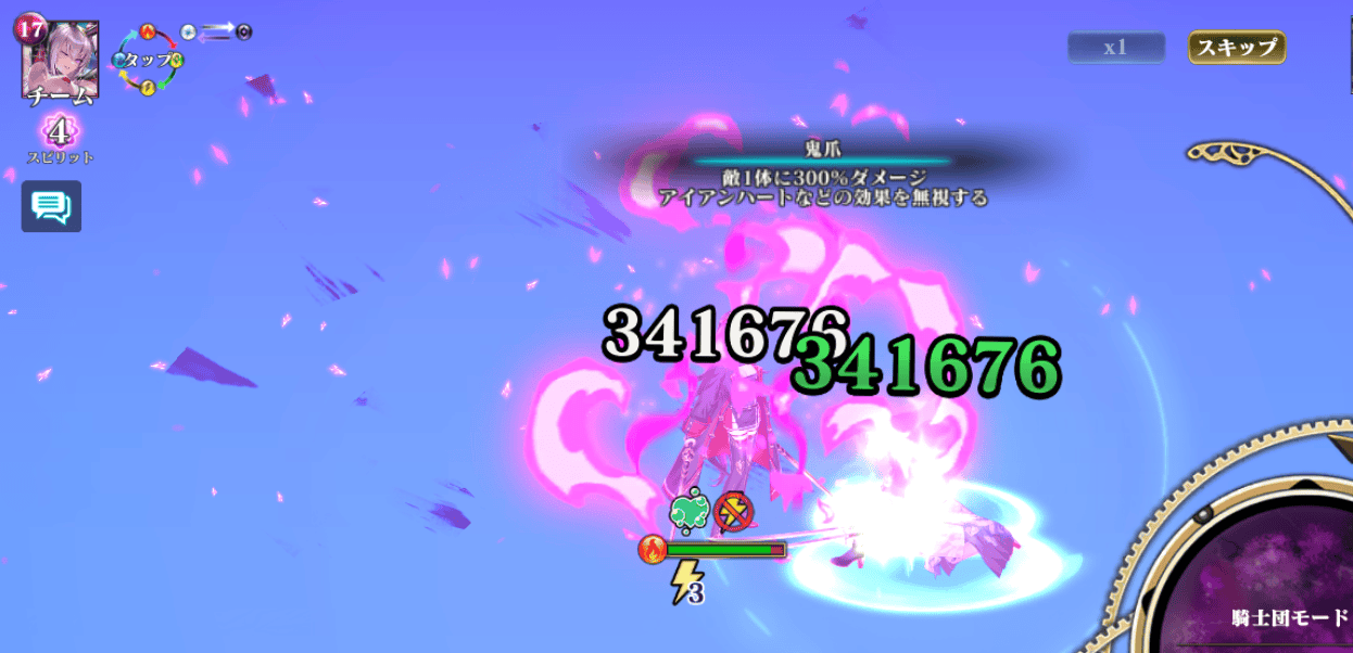 | 使用者は150TUの間、剣鬼になる。このキャラが場に出てから、攻撃で敵を1体も倒していない時のみ使用可能。また、このスキルは使用後、150TUの間ロックされる。 剣鬼の間、このキャラは以下の効果が発動する。 -敵味方問わず任意のキャラのターン終了時、自身のHPが最大値の50%分回復する。 -ちょうど2体を対象にする攻撃を受けない(場に味方が2体のみいる場合の全体攻撃などは、「2体を対象とする攻撃」に含まれない)。 -攻撃力が1.5倍される。この効果は、アンガー系の効果と重複しない。 |