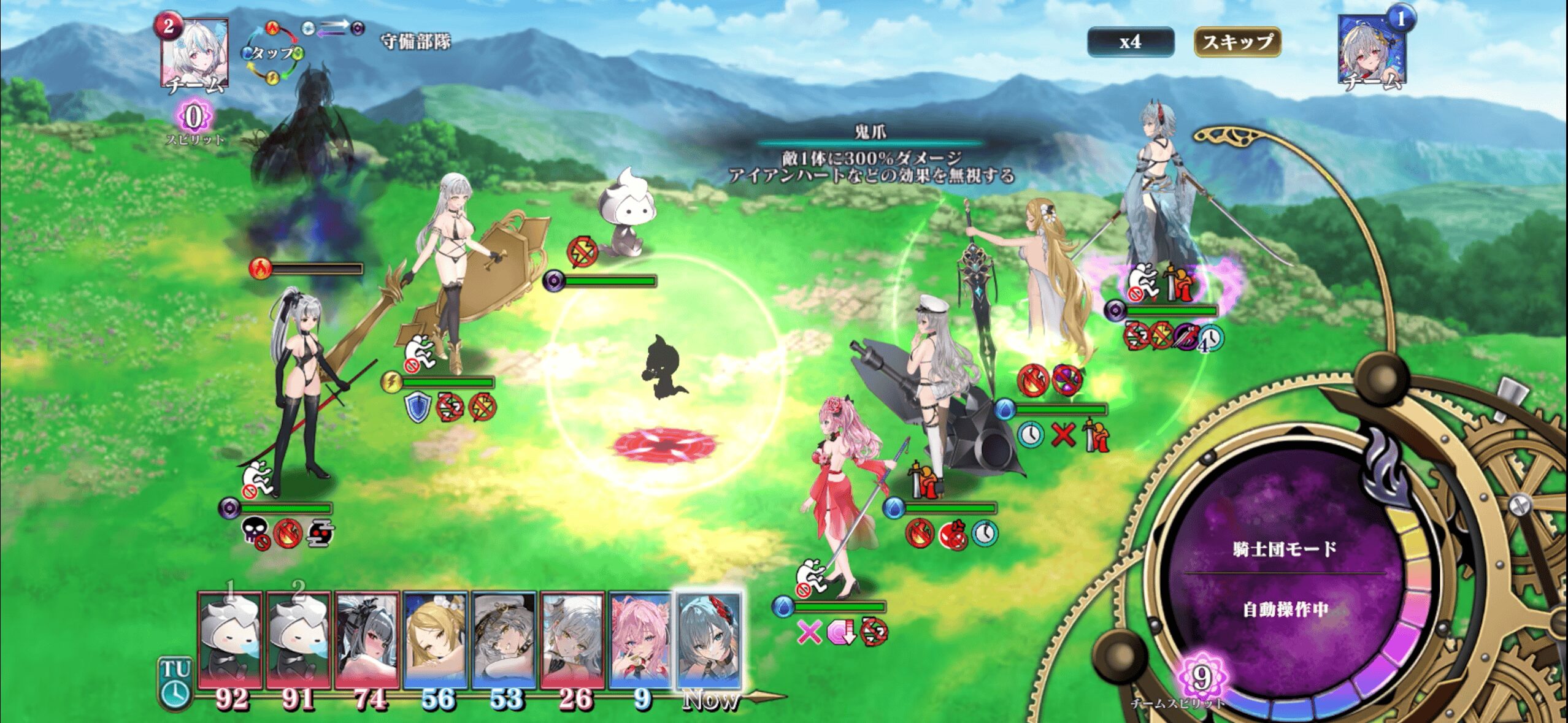 | 場にいる燃焼状態の味方全員のHPを、使用者の攻撃力の800%分回復し、また「アンガー」を付与する。対象の既存の「アンガー」系及び「怯え」系の効果は上書きされる。 -アンガー状態のキャラは次の自分のターンの攻撃力が1.5倍され、その後アンガー状態は解除される。 その後、ランダムな味方1体と、ランダムな敵1体に状態変化「燃焼」を付与し(対象の既存の状態変化は上書きされる)、また「伝染(燃焼)」状態にする。 自身のチャージが3貯まっている時のみ使用可能。チャージは使用後0に戻る。 -伝染(燃焼)状態のキャラは、敵味方問わず任意のターン終了時に、場にいる燃焼状態でないランダムな(そのキャラにとっての)味方1体に、状態変化「燃焼」を付与する(対象の既存の状態変化は上書きされる)。伝染状態のキャラが場を離れるか、もしくは伝染が三度発動すると、伝染状態は解除される(燃焼状態を付与できる味方がおらず、何も起きなかった場合にも発動したとみなされる)。伝染状態は状態変化ではなく、状態変化を上書きしたり状態変化に上書きされることがない。また、クリア系の効果でも解除されない。伝染状態のキャラは、伝染が3回発動して解除されるまで伝染状態がさらに付与されることはない。 |