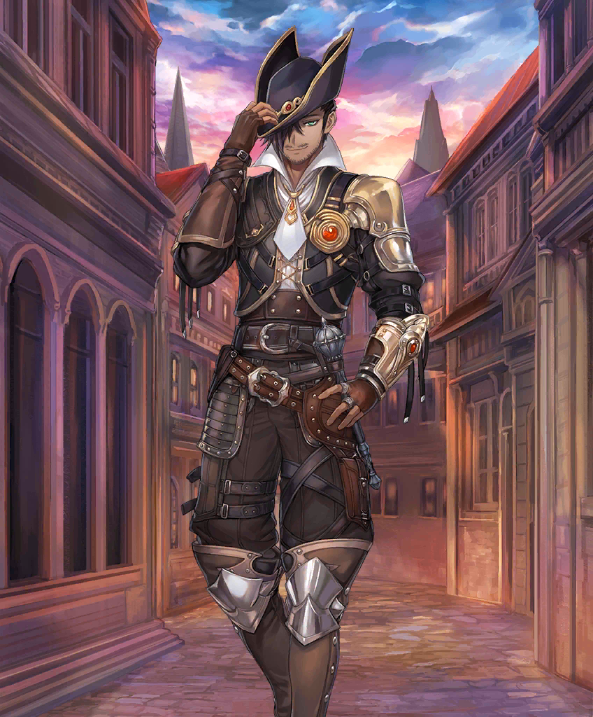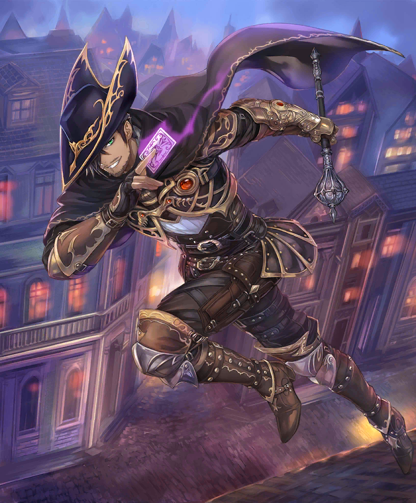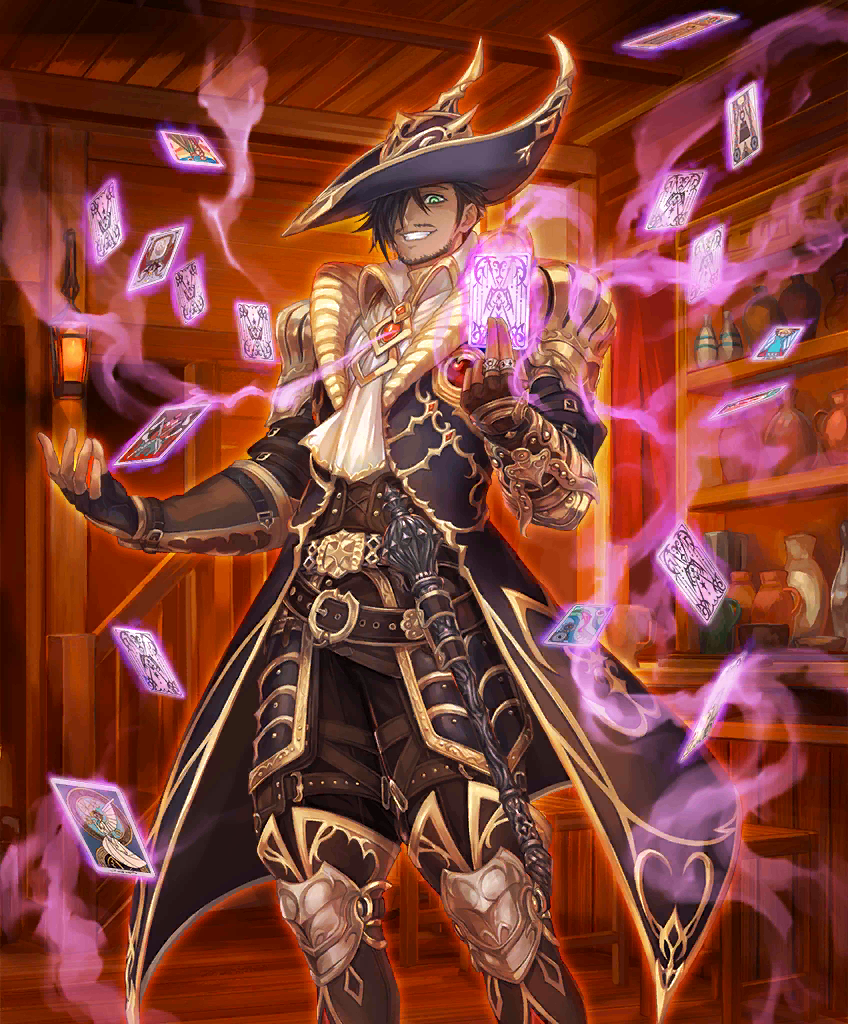 | 悪魔。タロットの大アルカナにおける15番目のカード。 不実、堕落、逃れられない宿命。 サイラスはとある領主の私生児として生まれ、子供の頃からタロットに慣れ親しんだ。 彼は幼い頃から聡明な子供だった。やがて彼は正妻が嫡子を生めば、自分は用済みになり殺される運命だということを知った。 命の危機を察知した彼は家を飛び出し、占い師を詐称する詐欺集団に身を置いた。 子供の頃に身につけたタロット術によって彼はそこでうまくやっていったが、他の仲間と違い、彼の占いに嘘はなかった。 例え外れるような予言でも、運命の方が彼の予言に従って変わっていくのだった。 |