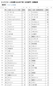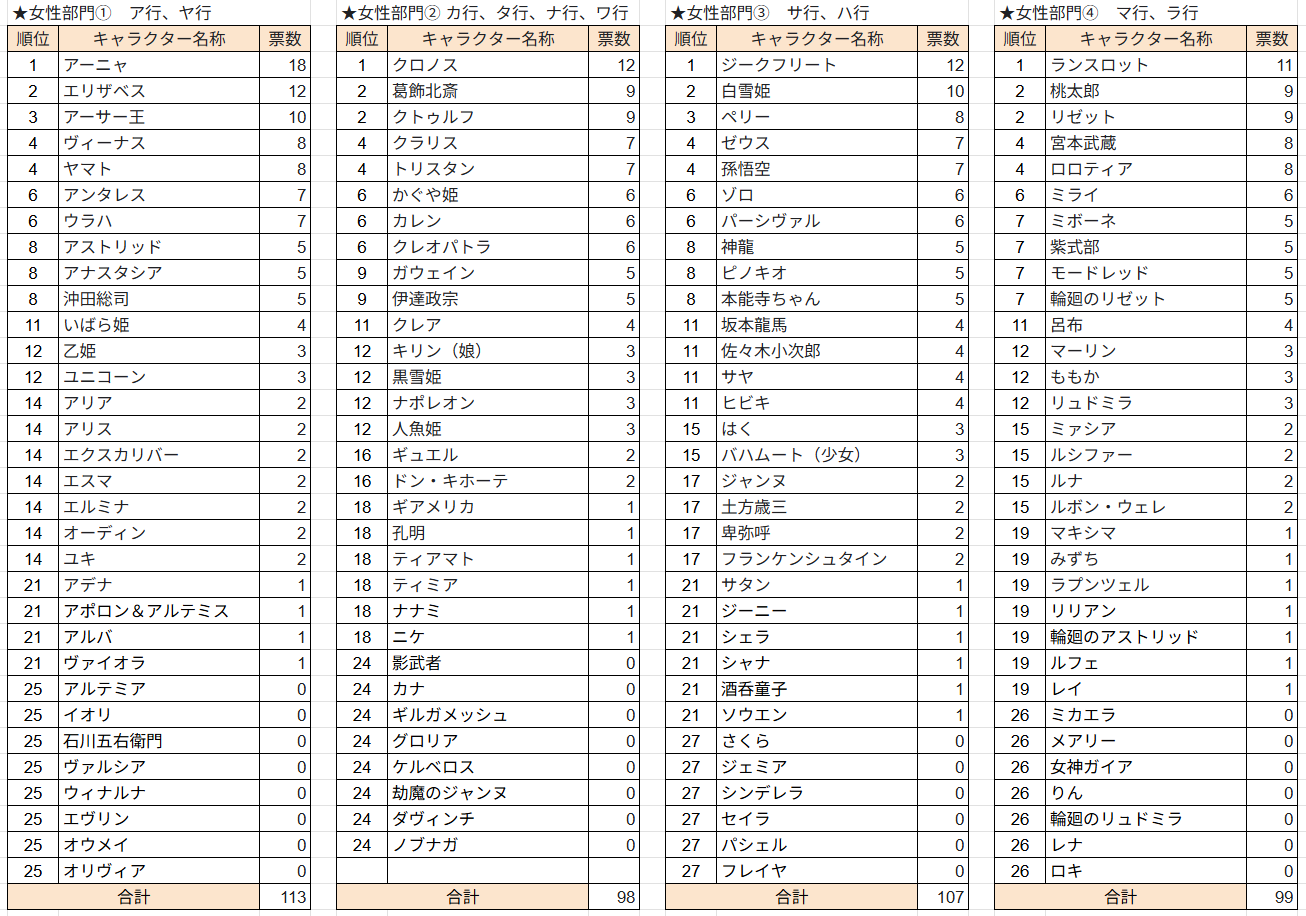 キャラ数が増えたため、女性部門はキャラ名の先頭文字で4組に分けました。投票結果は今までのように「女性部門」としてまとめて集計します。