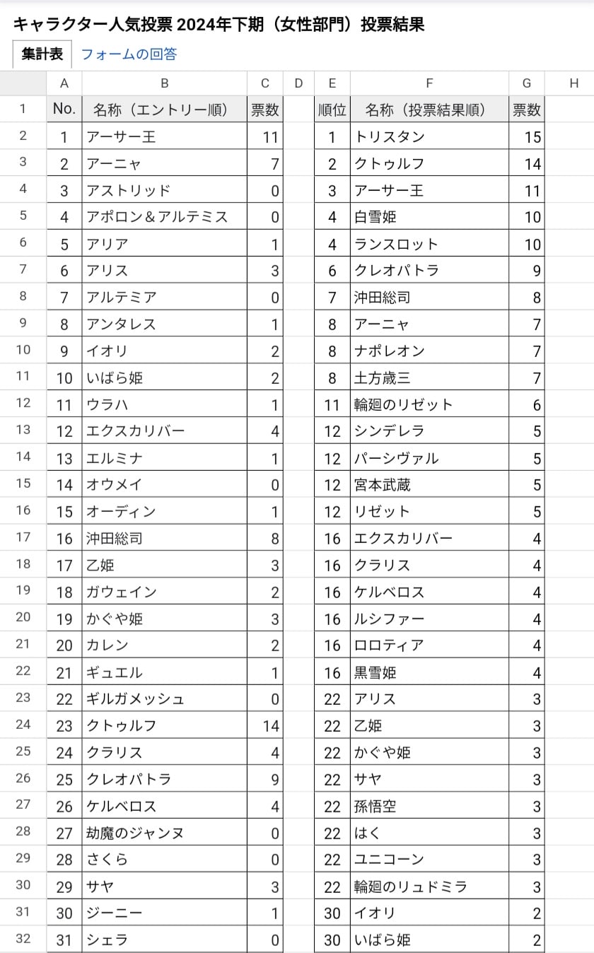| 1位 トリスタン (初登場) | 2位 クトゥルフ (初登場) | 3位 クレオパトラ (前回 16位) |