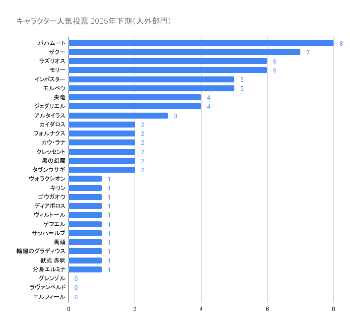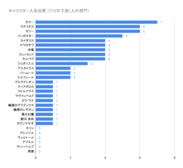 5位:カイダロス、キリン、バハムート、フォルナクス、ヴィルトール、クレッセント、ジェダリエル、インポスター、タヴンウサギ