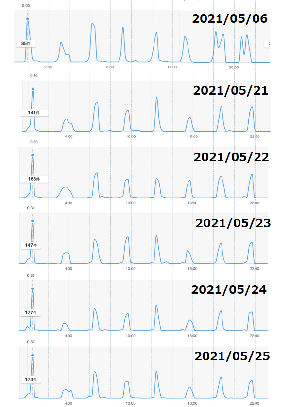 (2012/6/12現在のピーク時間帯) 1:15~1:30, 4:15~4:30, 7:15~7:30, 10:15~10:30, 13:15~13:30, 16:15~16:30, 19:15~19:30, 22:15~22:30
